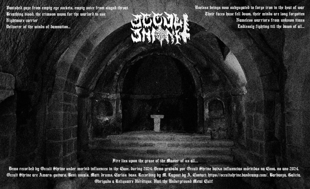 From the shadowed heart of Spain’s underground emerges Occult Shrine, a band devoted to Black Metal in its most arcane and unrepentant form. Rooted in ritual, obsession, and a fierce commitment to the genre’s spiritual core, Occult Shrine reject modern dilution in favor of an atmosphere steeped in darkness and invocation. Their work stands as a testament to Black Metal not merely as music, but as praxis—an occult shrine in sound, raised against the profane world.