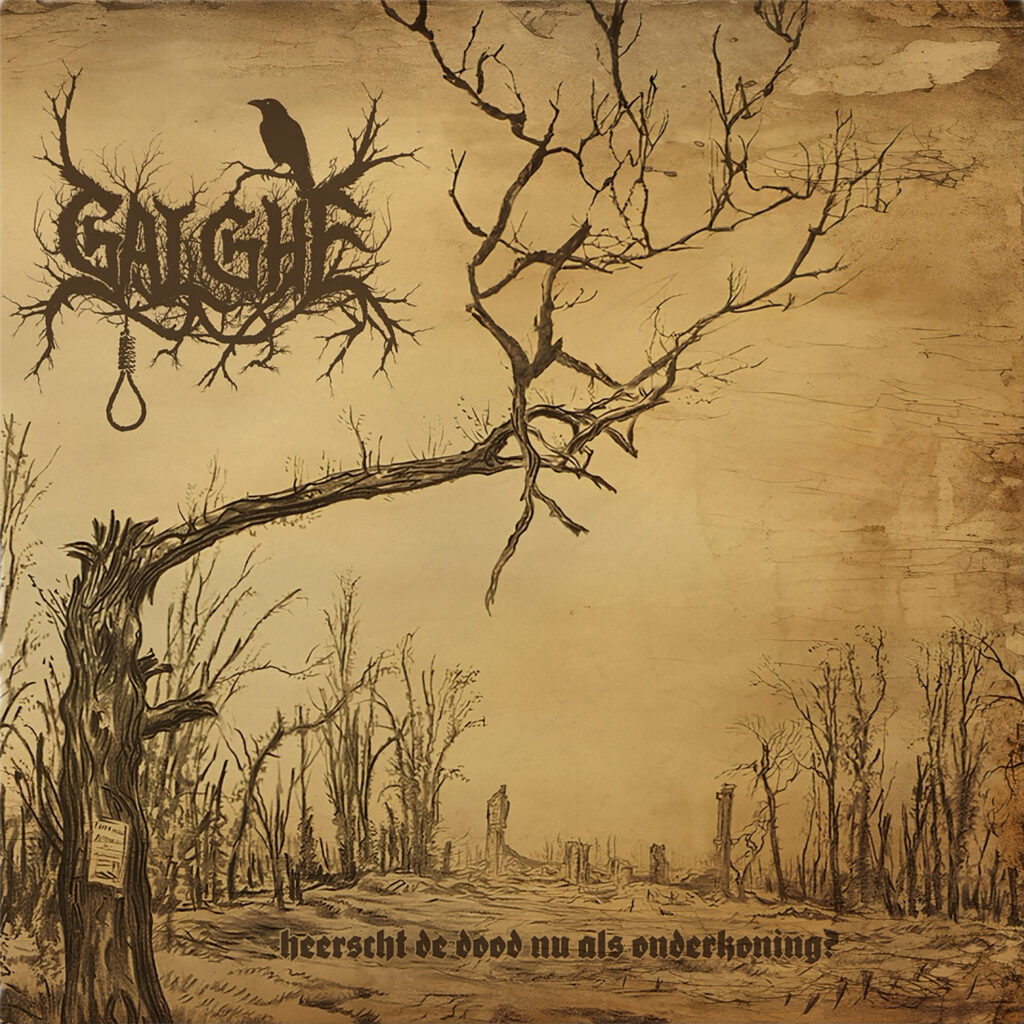 Als vocalist J. van Galghe je een plak vinyl in de handen duwt, heb je weinig keuze: luisteren zal je! En zo geschiedde. Heerst De Dood Nu Als Onderkoning is de titel van deze langspeler. Een naam die meteen het juiste gewicht in de schaal legt. De sepia cover-art, met een afgebroken boom, fungeert als een passende visuele voorbode van wat volgt. Desolaat en onverbiddelijk is de kern van Galghe’s sound. Ook het logo van Galghe laat weinig ruimte voor interpretatie.